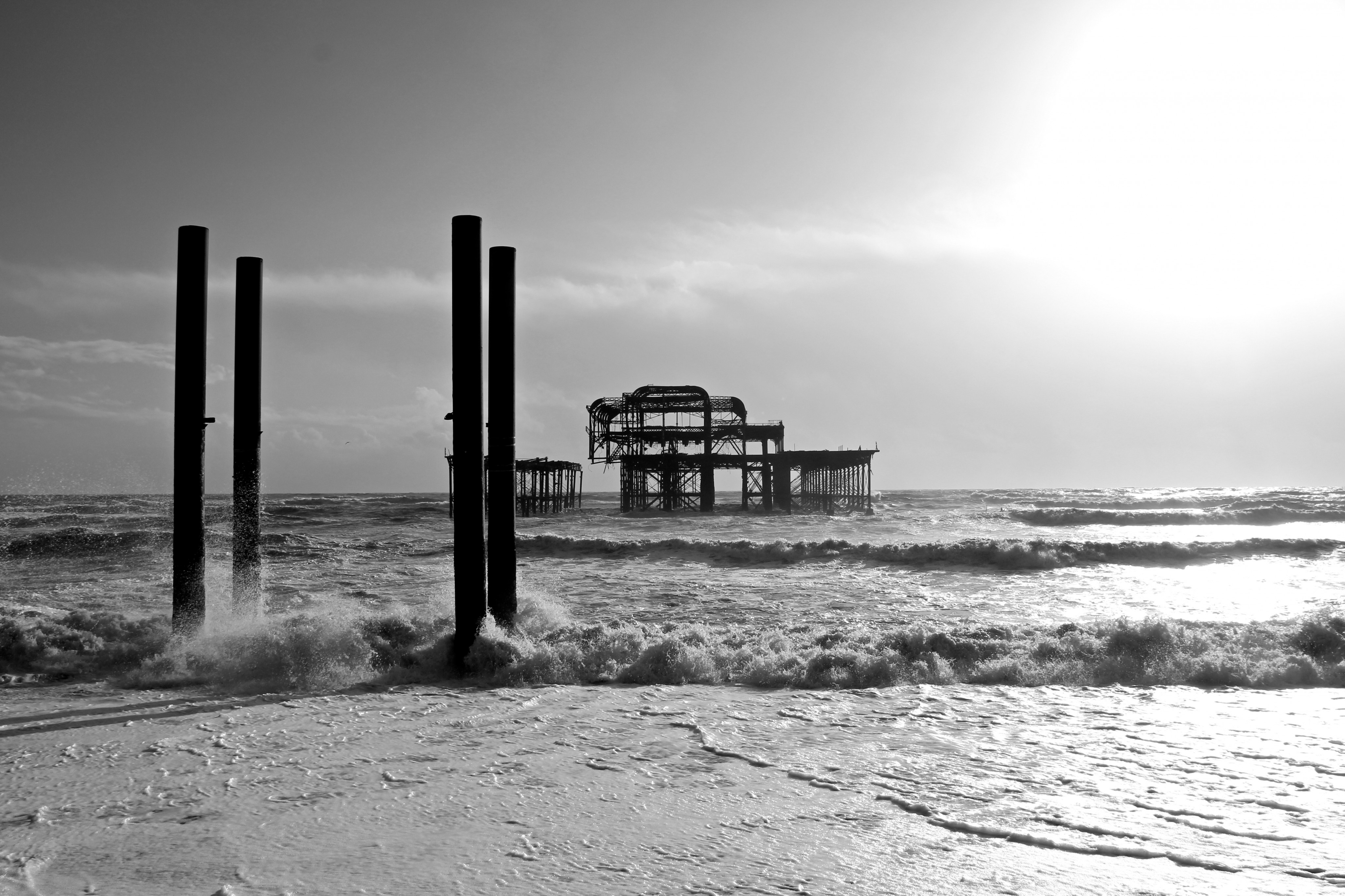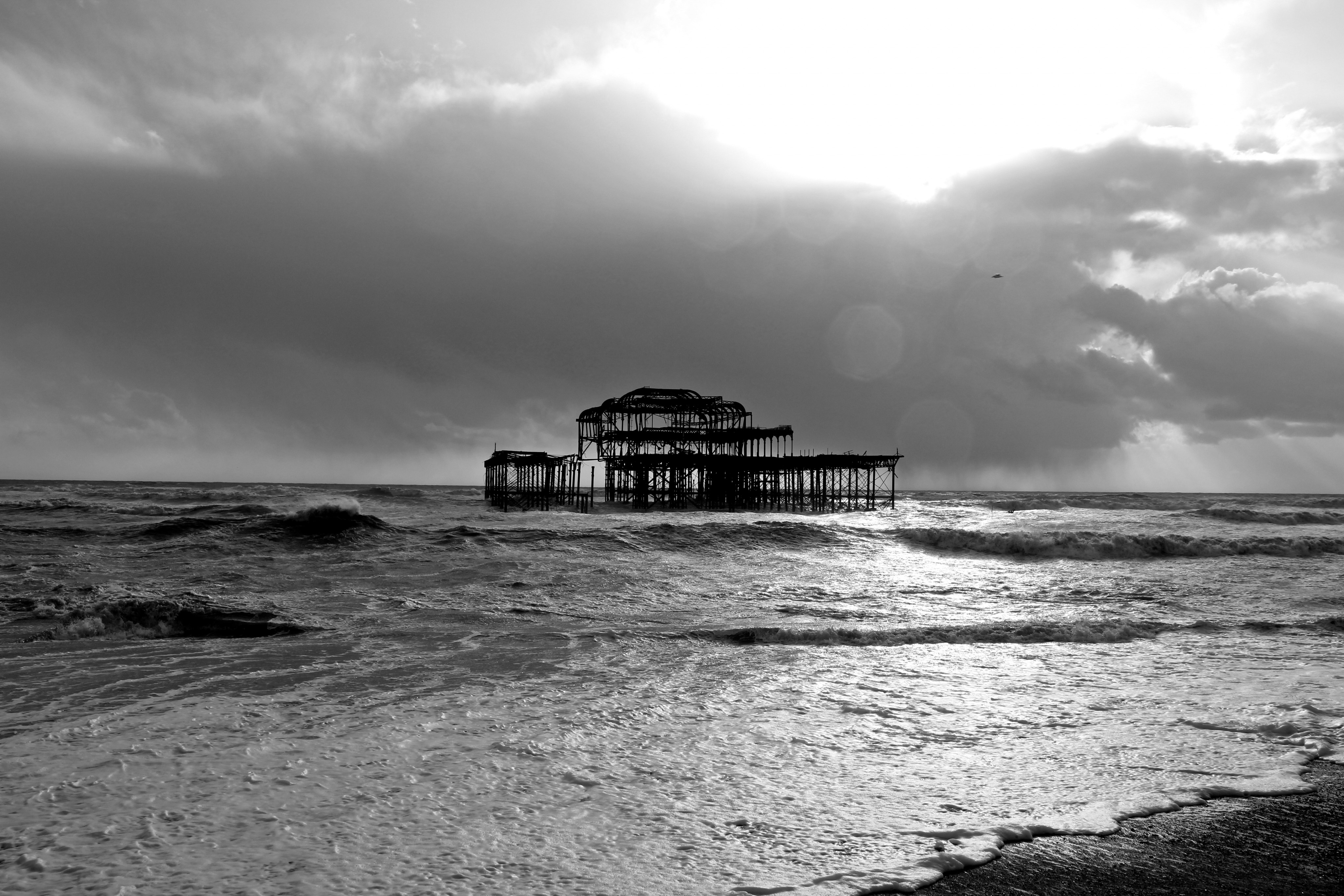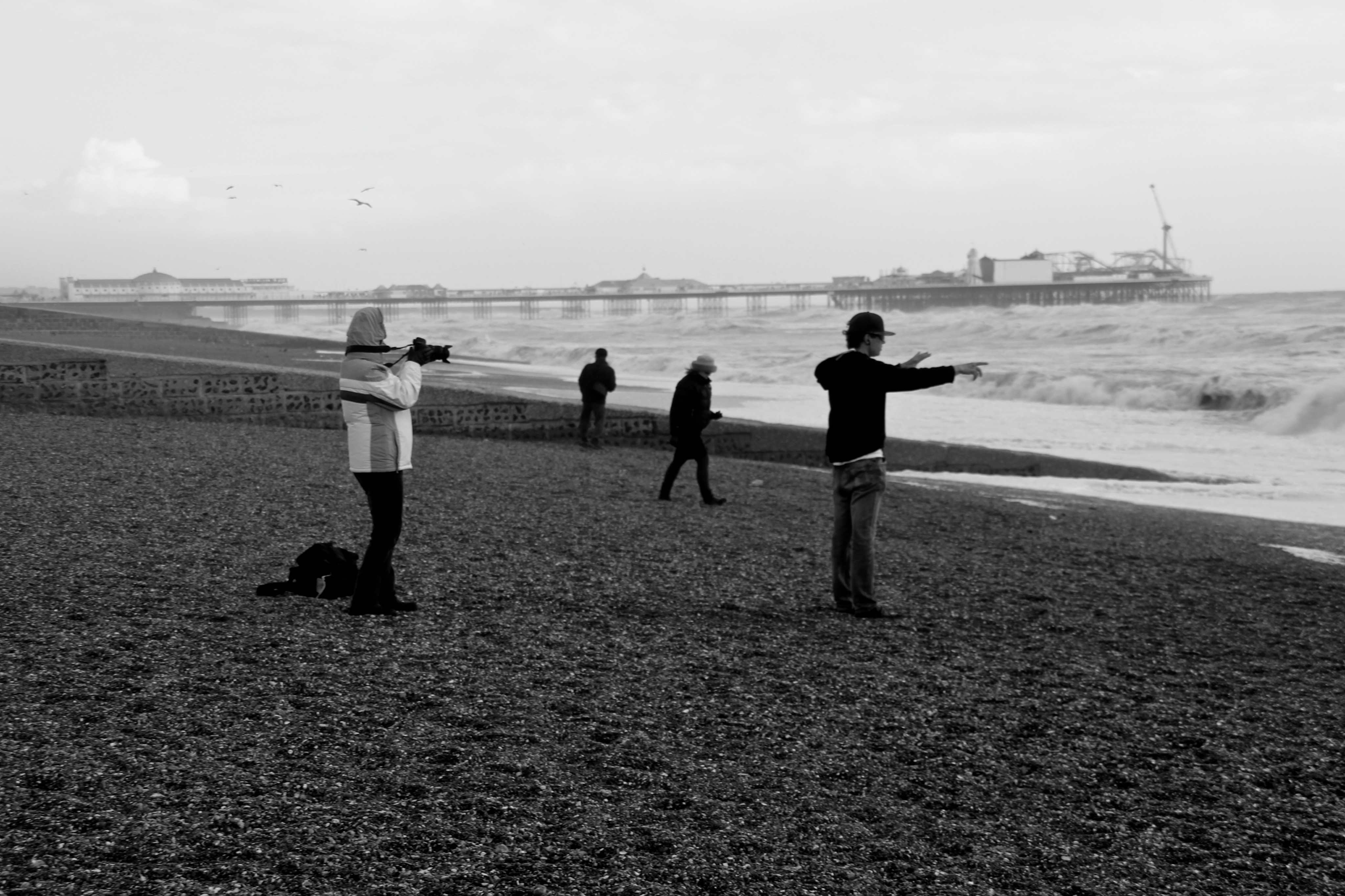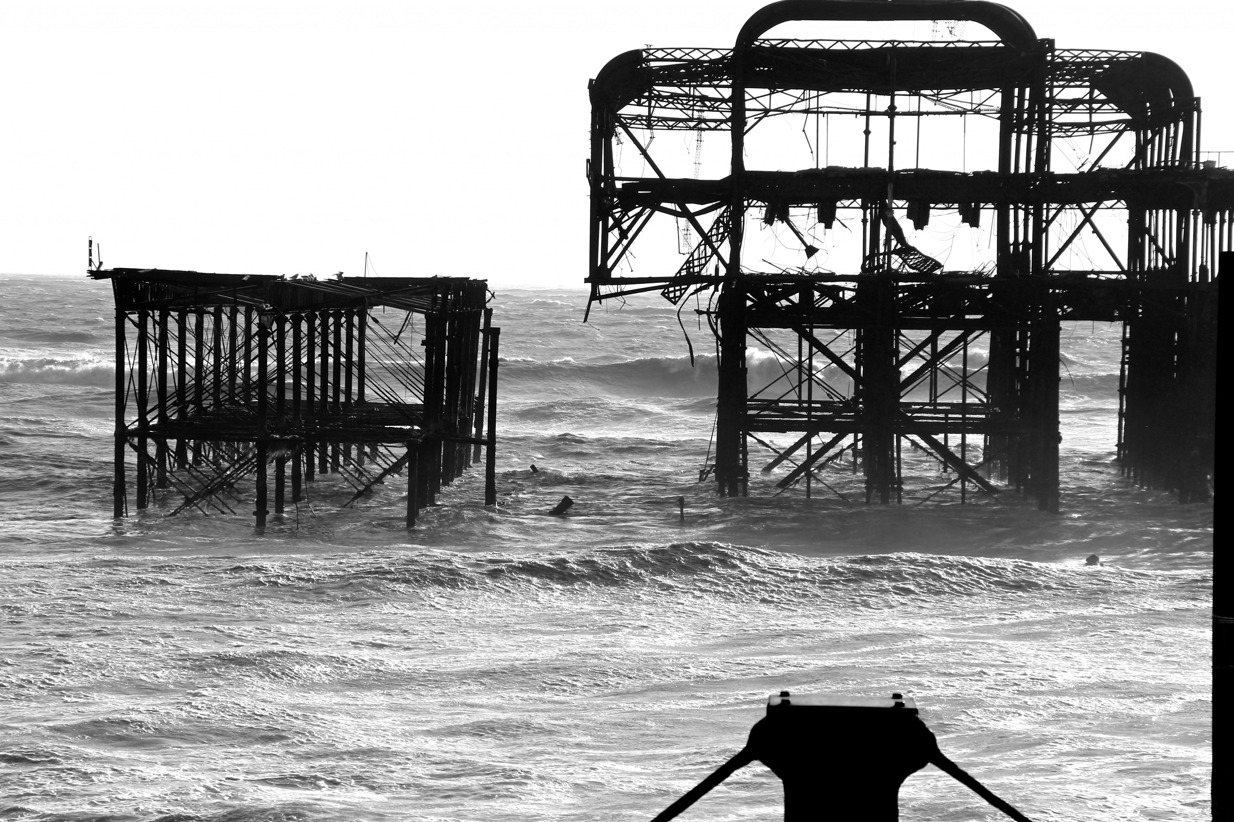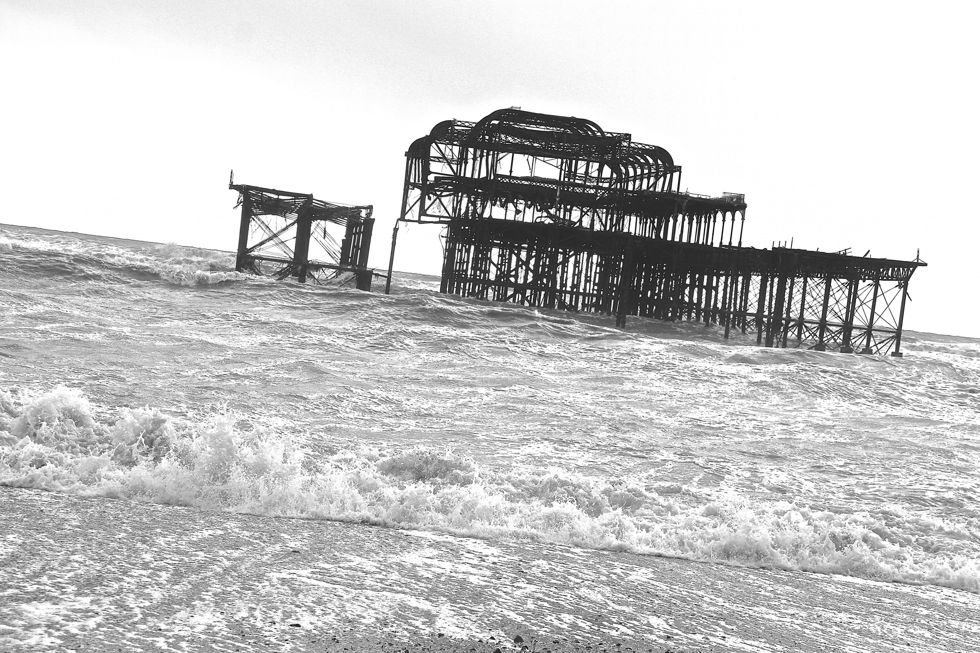 Yesterday (9/02/14) I popped out in the sun/rain to take a look at the damage to Brighton’s West Pier. Despite the weather there were 40 or so people gathered around it looking at the damage, most of them had a camera. Fascinatingly there was a man recording a rap music video and a couple having a barbecue.
